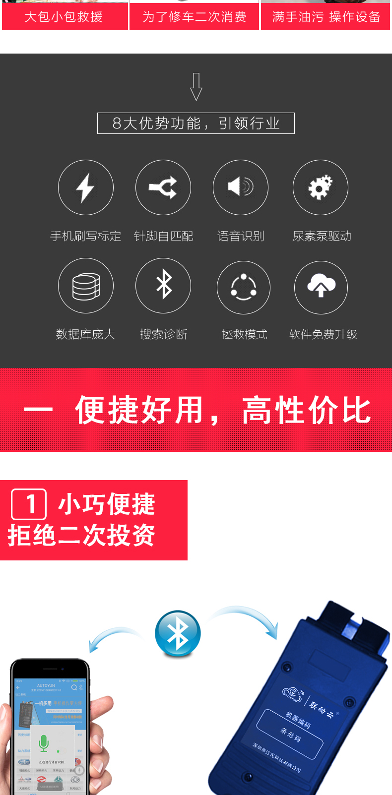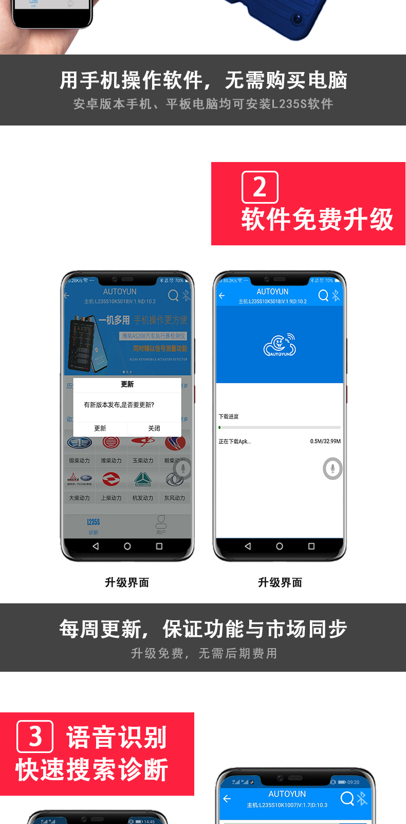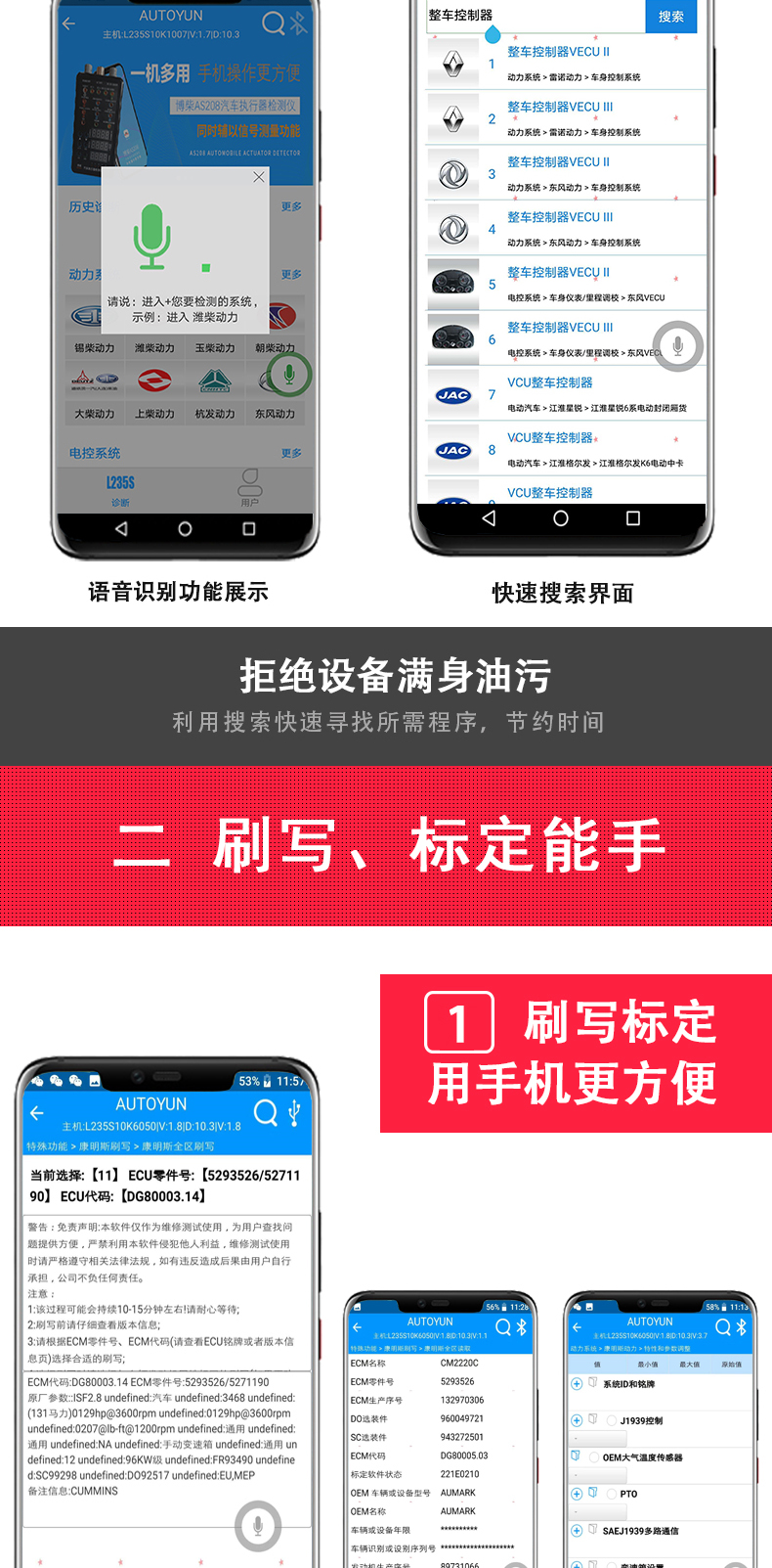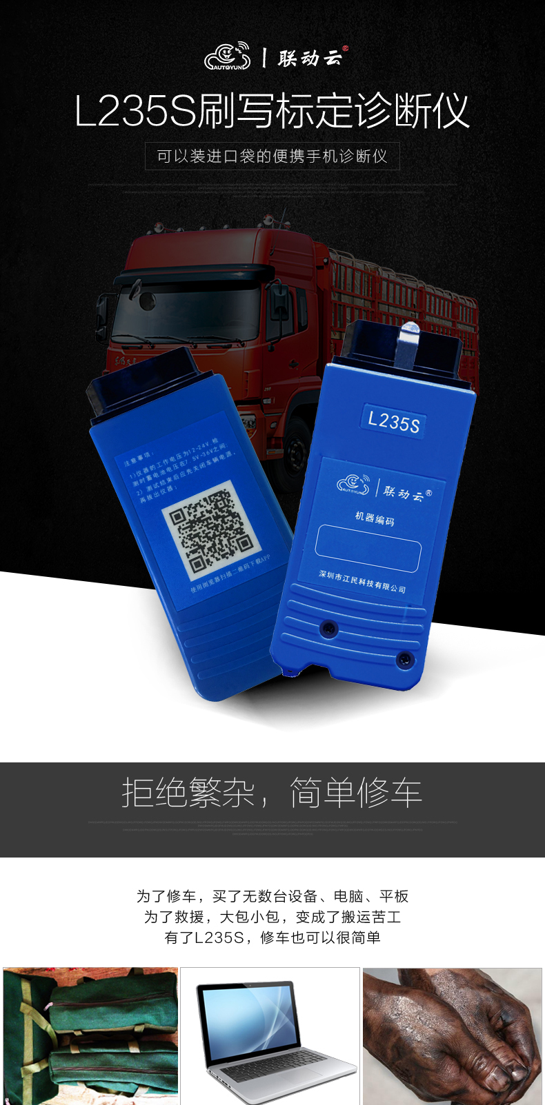 聯(lián)動(dòng)云L235S智能語音版手機(jī)診斷儀開創(chuàng)商用車診斷便捷化,一個(gè)插頭足可以診斷幾乎市面上包含工程車輛,卡客車,大中小柴油系列發(fā)動(dòng)機(jī),修車隨時(shí)隨地?zé)o懼刮風(fēng)下雨,無懼天冷手凍,無懼電腦沒電,一個(gè)診斷設(shè)備可以同時(shí)安裝五部手機(jī)使用,具備故障診斷,標(biāo)定刷寫,是維修技師外出應(yīng)急救援必備神器,同時(shí)也是維修門店必備的第二臺(tái)診斷設(shè)備,解放雙手語音喚醒進(jìn)系統(tǒng),簡(jiǎn)單快捷,方便高效。